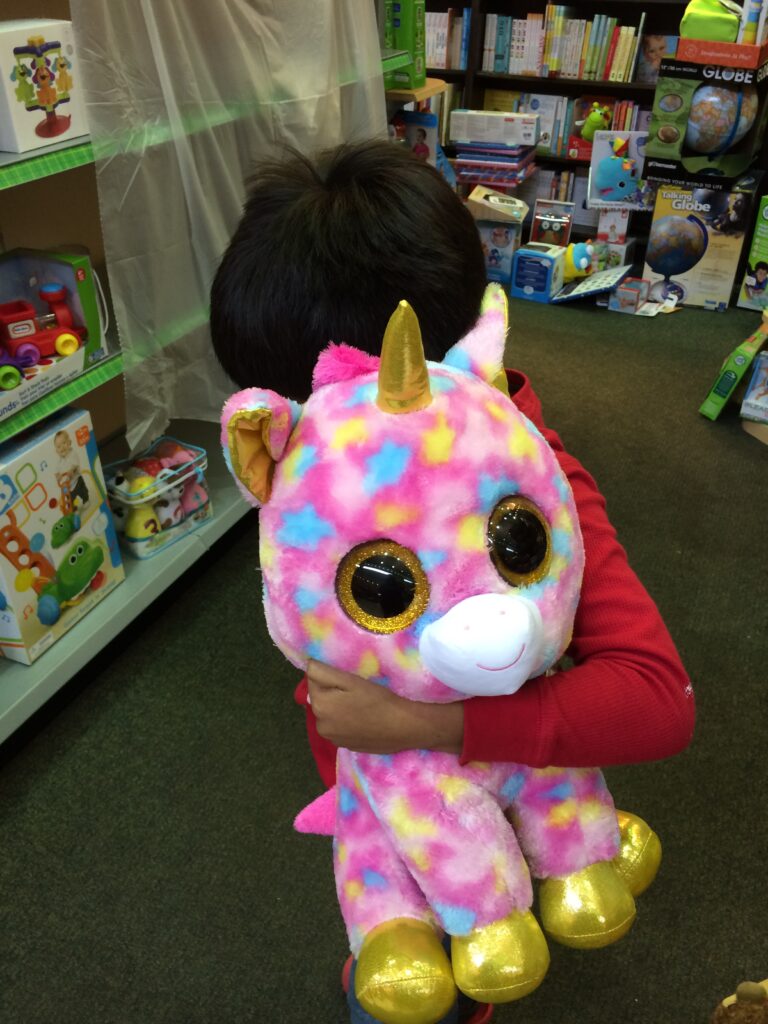 That evening, Giovanni cried in my bed. “I loved it, Mami. It’s so sad the unicorn didn’t come home with us.” I joined him in sadness and a few tears. Together, we sent a wish of hope that the new owner would love it just as much and that the unicorn would find happiness in another home.